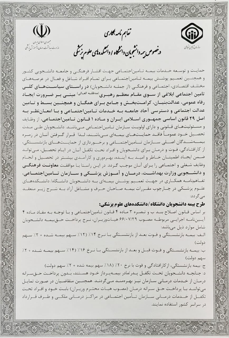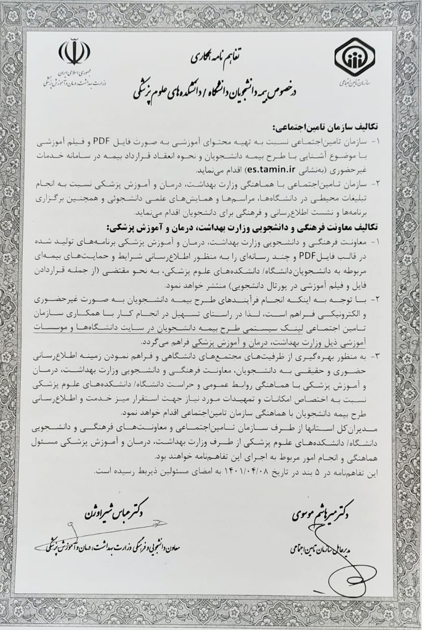 به اطلاع می رساند در راستای ایجاد رفاه، امنیت بیمه ای و بهره مندی دانشجویان علوم پزشکی از خدمات بیمه تأمین اجتماعی و همچنین لحاظ شدن دوران تحصیلی به عنوان سابقه بیمه، تفاهم نامه ای میان معاونت فرهنگی دانشجویی وزارت بهداشت و سازمان تأمین اجتماعی منعقد گردیده است و دانشجویان گرامی در دانشگاه/دانشکده های علوم پزشکی کشور می توانند با مراجعه به درگاه اینترنتی سازمان تأمین اجتماعی به آدرس es.tamin.ir و پرداخت حق بیمه از خدمات مذکور بهره مند شوند.