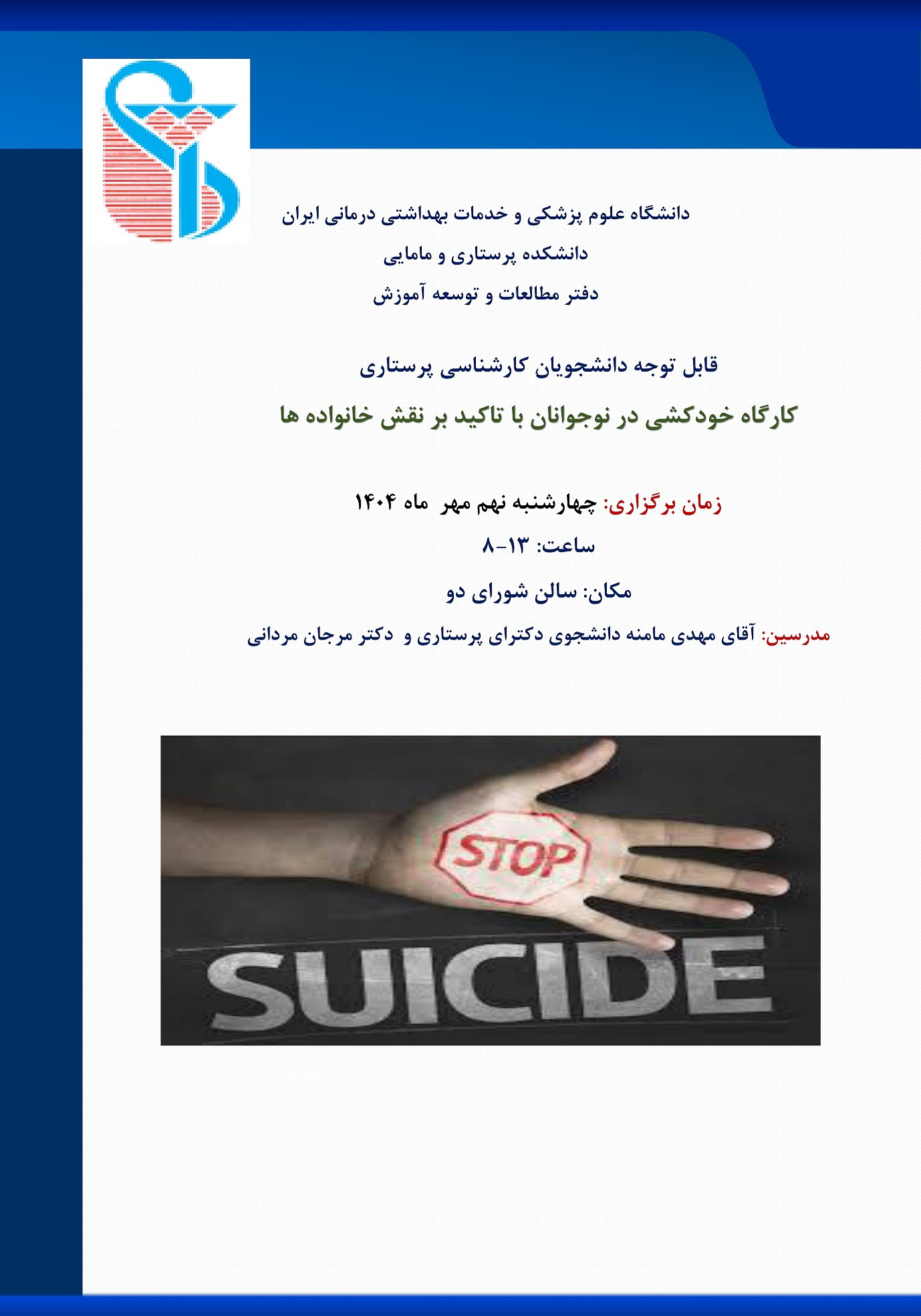 کارگاه خودکشی در نوجوانان با تاکید بر نقش خانواده ها 1404/06/31 - 08:35 - تعداد بازدید: 52 - تعداد بازدید کنندگان: 51 - کد خبر : 357667 - گروه اخبار : اطلاعیه ها - تعداد کامنت ها : 0 357667.mp3 کارگاه خودکشی در نوجوانان با تاکید بر نقش خانواده ها